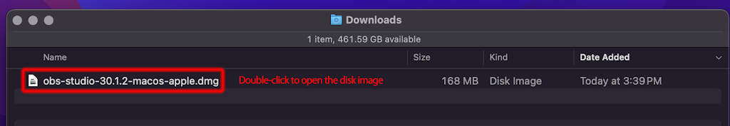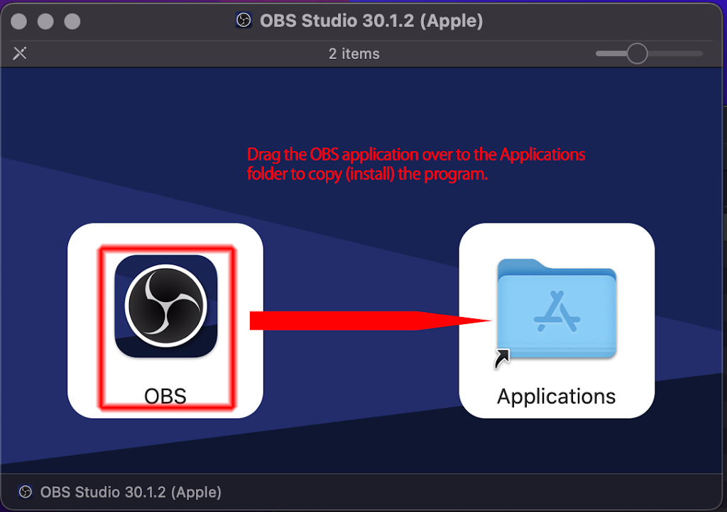 4.1.b – Double-click the disk image file to open it and drag the OBS application onto the Applications folder to copy (install) it.