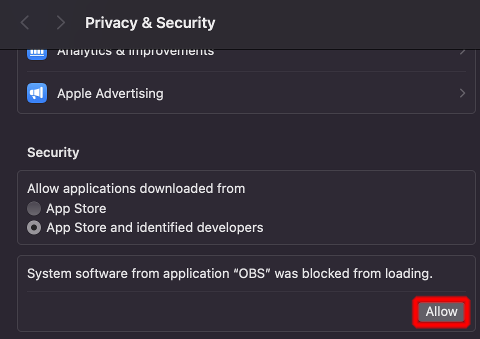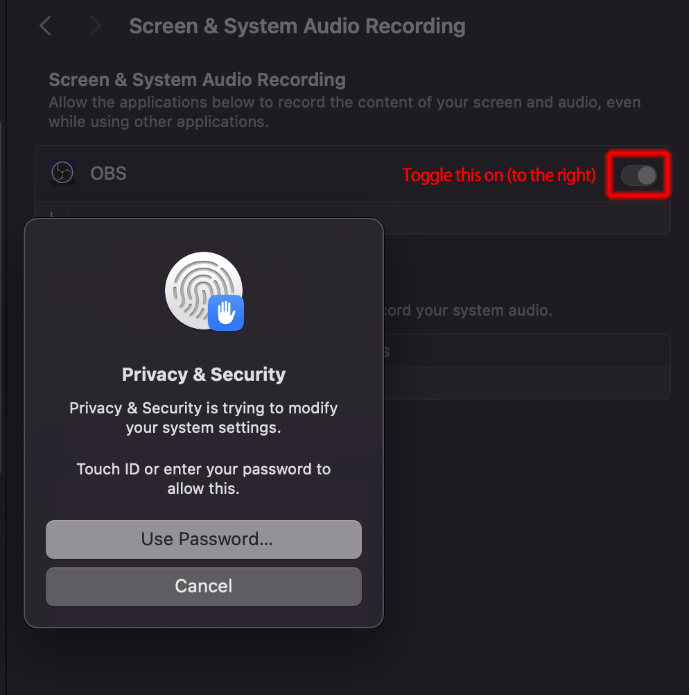 Click on Open Screen Recording Preferences and click on the toggle (if the toggle is to the right, this gives OBS permission to access that functionality).  You will need to enter in the administrator password (or use Touch ID if applicable) as confirmation.