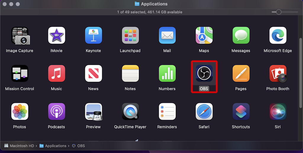In the Finder, open the Applications folder and double-click OBS to launch it.