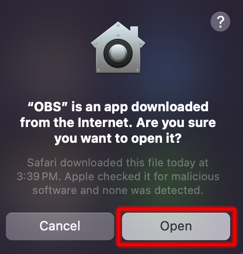 The system will put up a dialog like the following when running the application for the first time.  Click on Open.