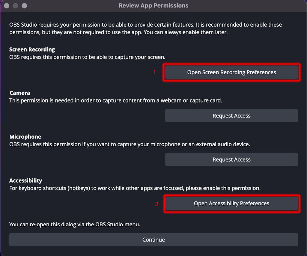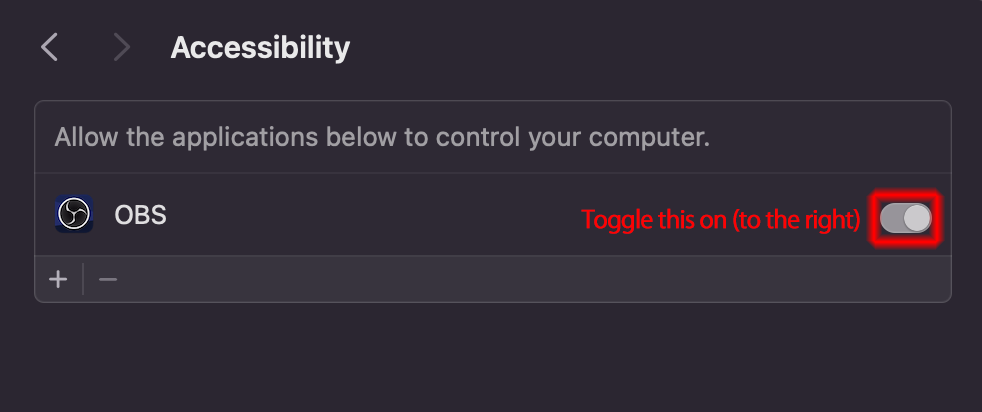For the Accessibility (2) permissions, this is mainly for hotkey access (which is useful if using a remote controller application like OBS Blade) when OBS is not in the foreground/gets accidentally backgrounded.  If you want to enable this, click on Open Accessibility Preferences and click on the toggle (if the toggle is to the right, this gives OBS permission to access that functionality).  You will need to enter in the administrator password (or use Touch ID if applicable) as confirmation.