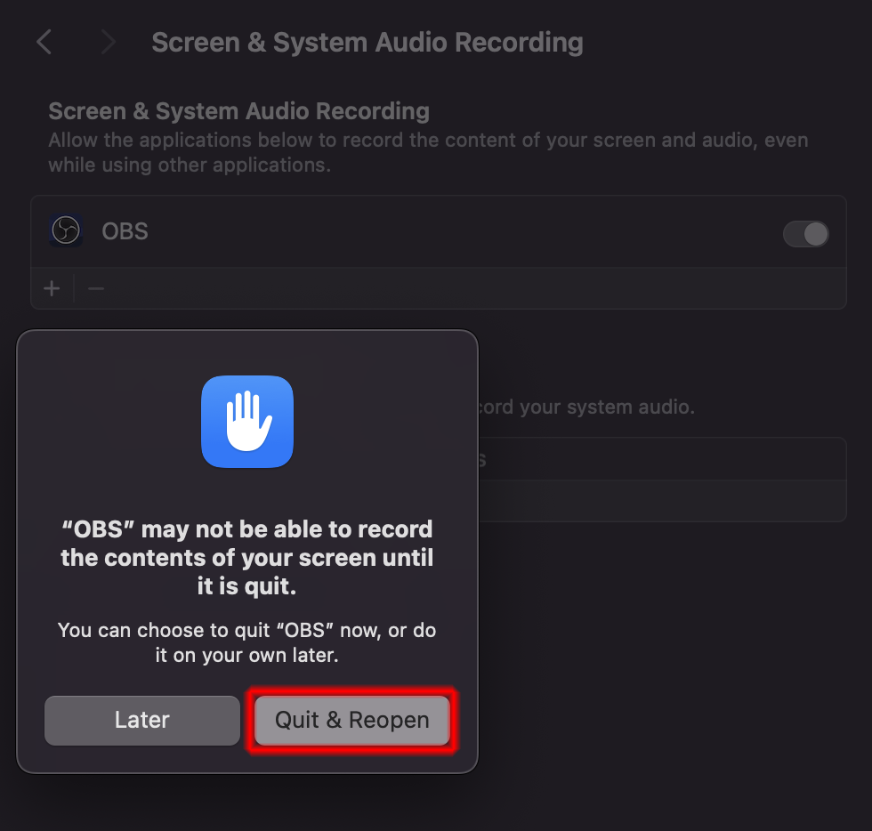 Optional: While the Screen Recording preference (1) is mainly to give system permission for OBS’ display capture, it also allows access to system audio functionality.  If that access is needed, it can be enabled as follows.
