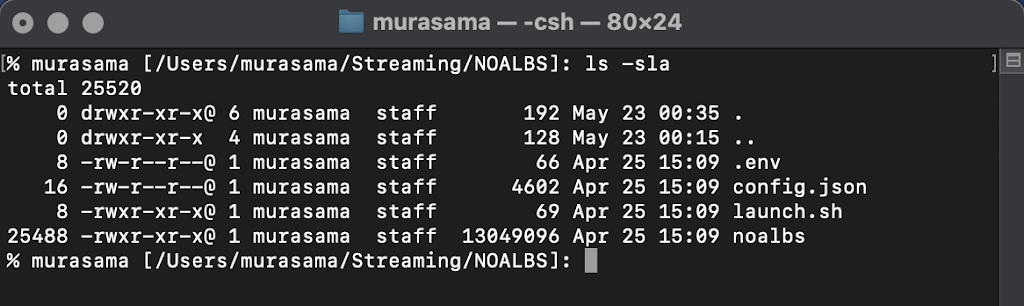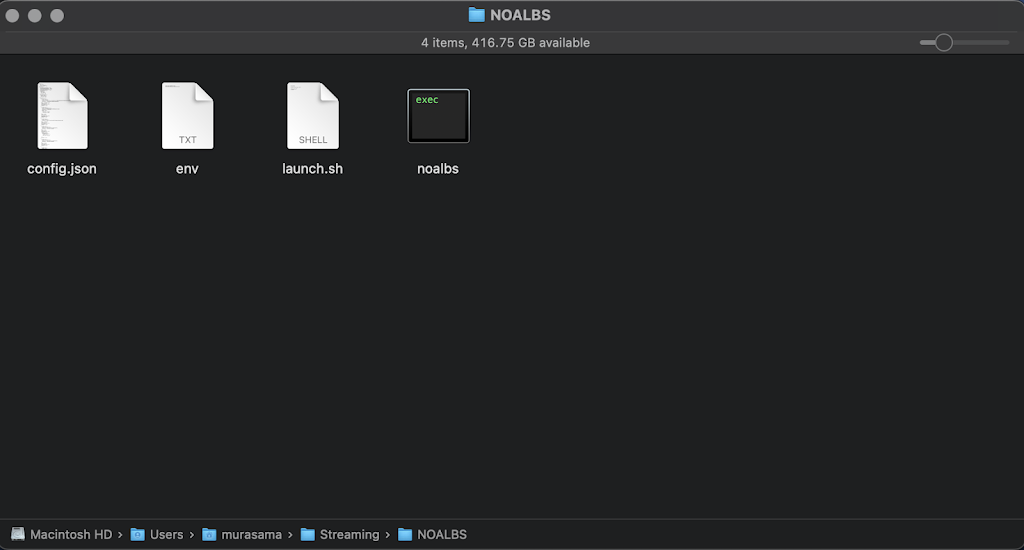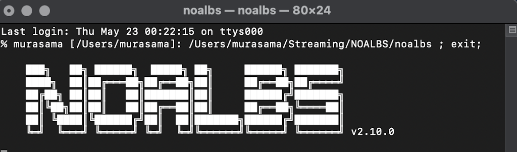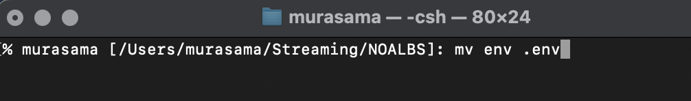 4.2.c – Open up a Terminal Window like the above (the Terminal application is located in the Utilities folder in the Applications folder) and enter the command cd /Users/yourusername/yourfoldername/NOALBS where yourusername = your username on the Mac and yourfoldername = the name of the folder you created and moved the NOALBS folder into. In this example, it would be “cd /Users/murasama/Streaming/NOALBS”. Then hit Enter/Return and type mv env .env and hit Enter/Return. The env file should now vanish in Finder. (You can show it in Finder by pressing Command + Shift + . )