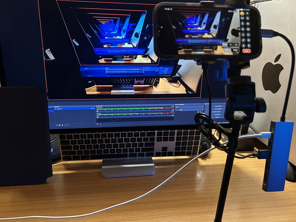 Finally, the following image is a bit of inception… but it’s a local SRT relay (Moblin to OBS) where it is possible to test various IRL scenarios without actually going live to a streaming platform. Moblin (iOS) is simply streaming live to OBS (running on either a Mac or PC) via a simple SRT relay (making it easy to test things like automatic scene switch via NOALBS), testing out overlays/alerts, or OBS remote control.