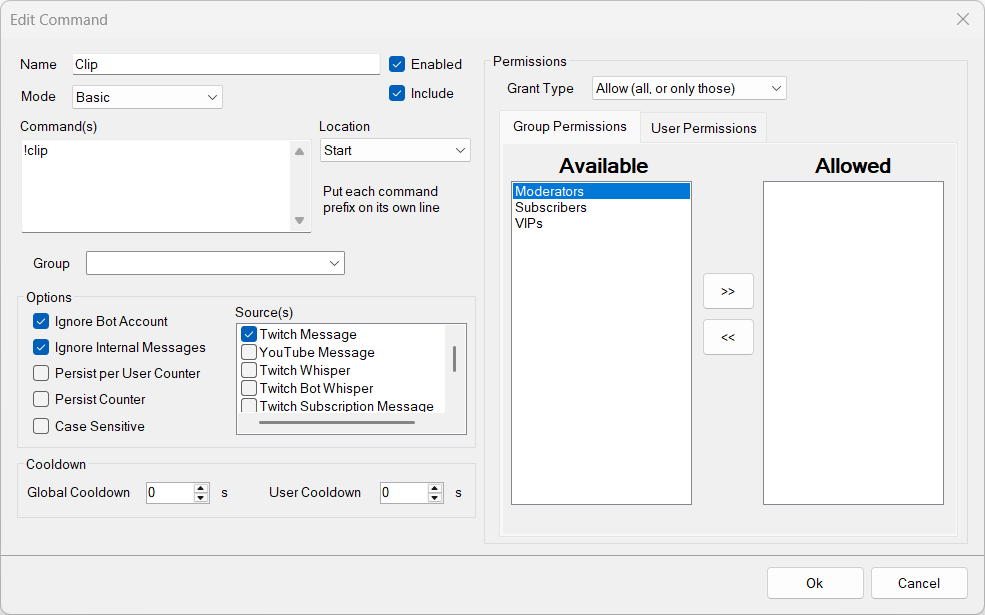 The global and user cooldowns can also be set here (0 means there is no cooldown which means it can be spammable). The global cooldown is the overall timer while the user cooldown is specific for each user. It is recommended the global cooldown be set to something like 15-30 seconds (only one clip can be created every 15-30 seconds) while the user cooldown be something like 30 seconds.