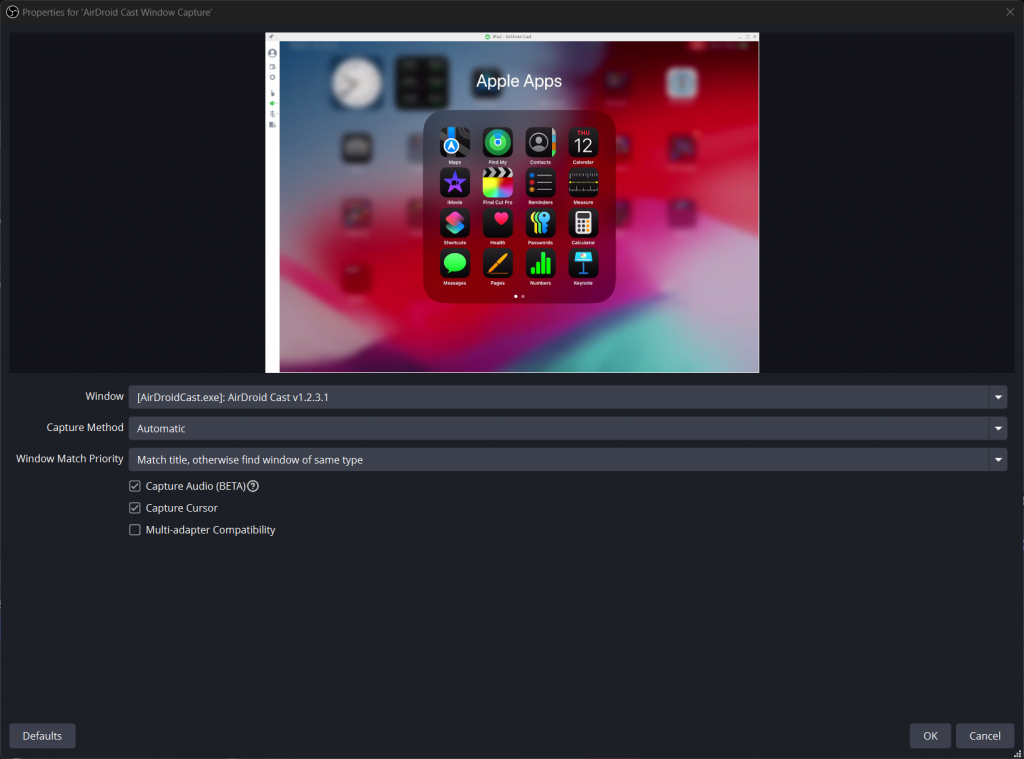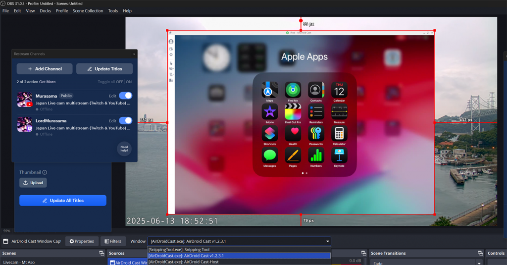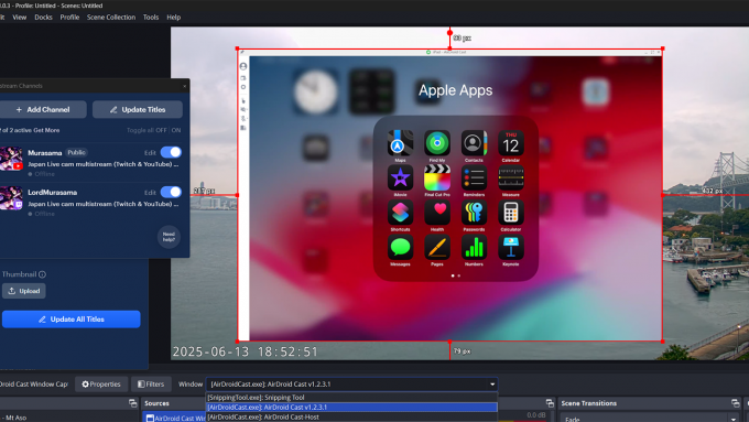Note: on future uses when re-running the above plus OBS, you will probably need to cycle (clicking) between the [AirDroidCast.exe]: AirDroid Cast-Host window and back to the [AirDroidCast.exe]: AirDroid Cast v#.#.#.# window pulldowns in OBS to get AirDroid Cast to display in the OBS scene again (do this once AirDroid Cast is running and mirroring your iPad/iPhone display).