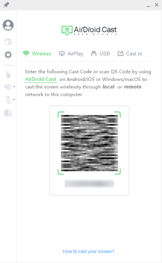 4) Once the installation is finished, launch the AirDroid Cast app (a shortcut should be located on the desktop). The following window will appear with a QR code and numeric code. Make sure “Wireless” is selected (in green).