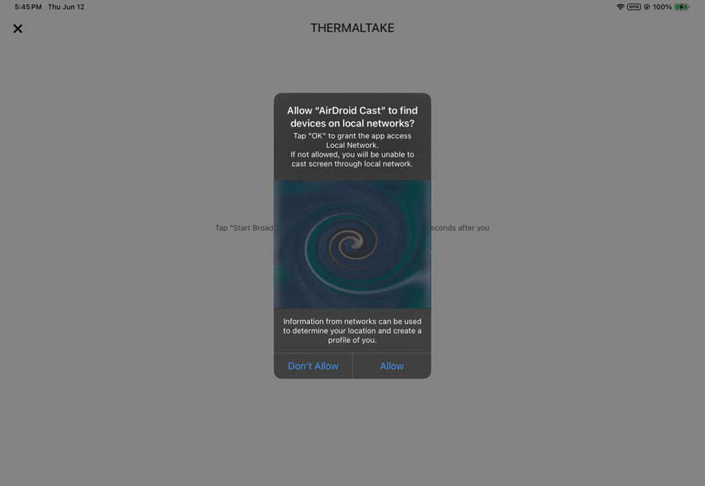 6) On the initial launch, the following dialog (with your location on a map shown) will be displayed on the iPad/iPhone. Tap “Allow” (this will allow AirDroid Cast to be able to find and screen cast to devices on the local network like a desktop PC).