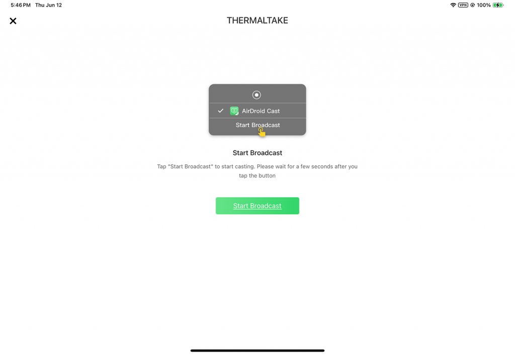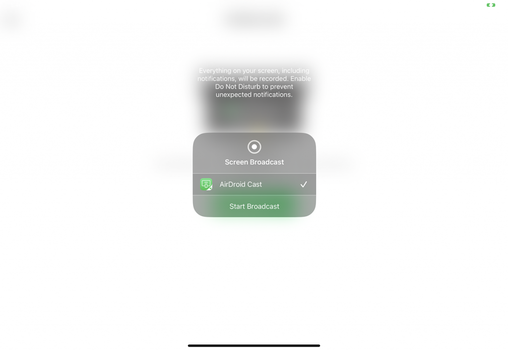 9) Tap the “Start Broadcast” on the AirDroid Cast Screen Broadcast pane.