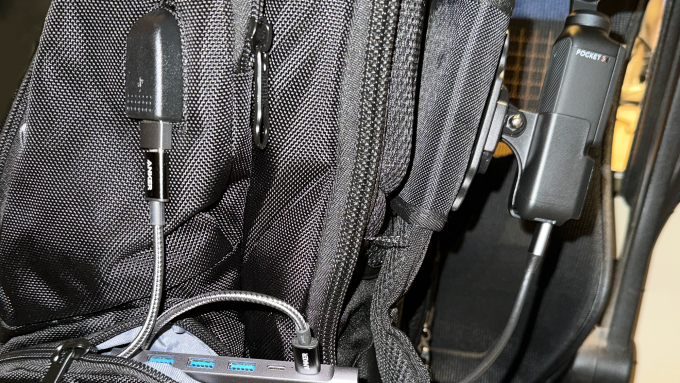The USB hub will actually be completely inside that zippered pouch with an extension USB-C cable running from the built-in hub connector to the Pocket 3 (it is directly connected in this photo).