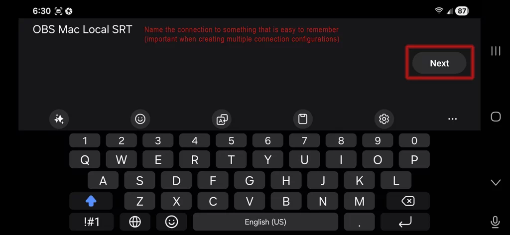 In this example, it is named for the SRT relay that will be running on OBS Mac. Tap the Next button.