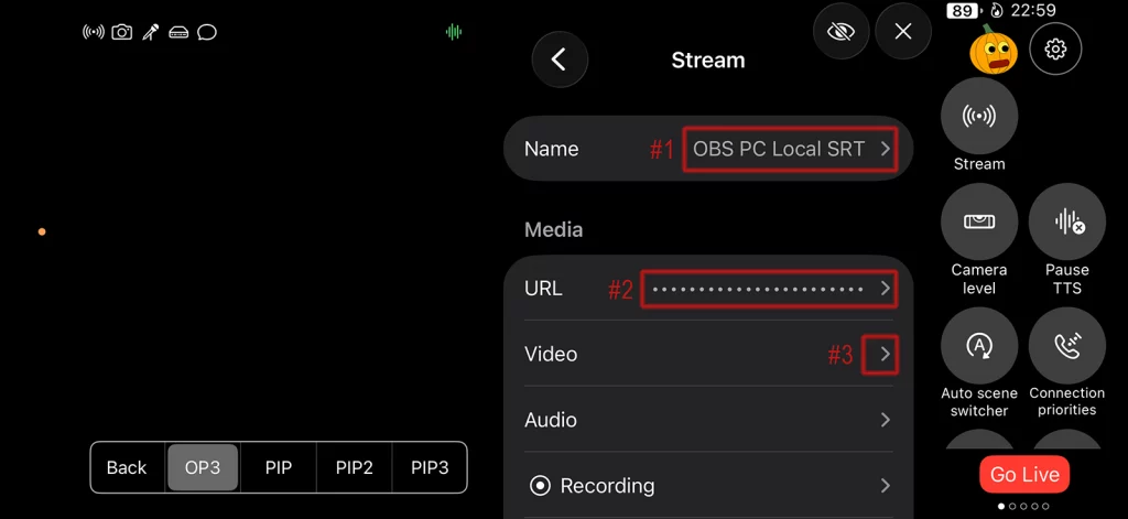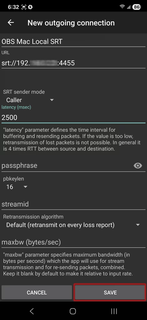 In this example, it is named for the SRT relay that will be running on OBS PC. Tap into the URL section and type in the SRT URL (#2) srt://YOUR-IP:4455 and replace “YOUR-IP” with your local/internal/private IP address. Refer to the section above to get your IP address for Windows or for Mac if you are unsure on how to find this.