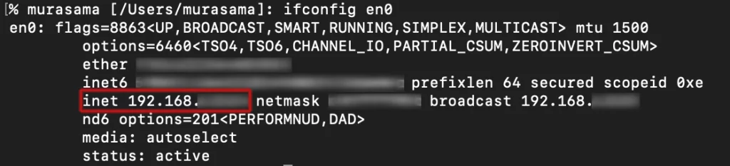 The network connection (wired or wireless) for most setups will normally be on either en0 or en1; if you type in ifconfig by itself, it will list every possible interface (which can make it difficult to find the proper ethernet interface with the internal IP address). Therefore, first try “ifconfig en0” (and if there is no assigned IP address, try “ifconfig en1”). The IPv4 address will be the one after the inet.