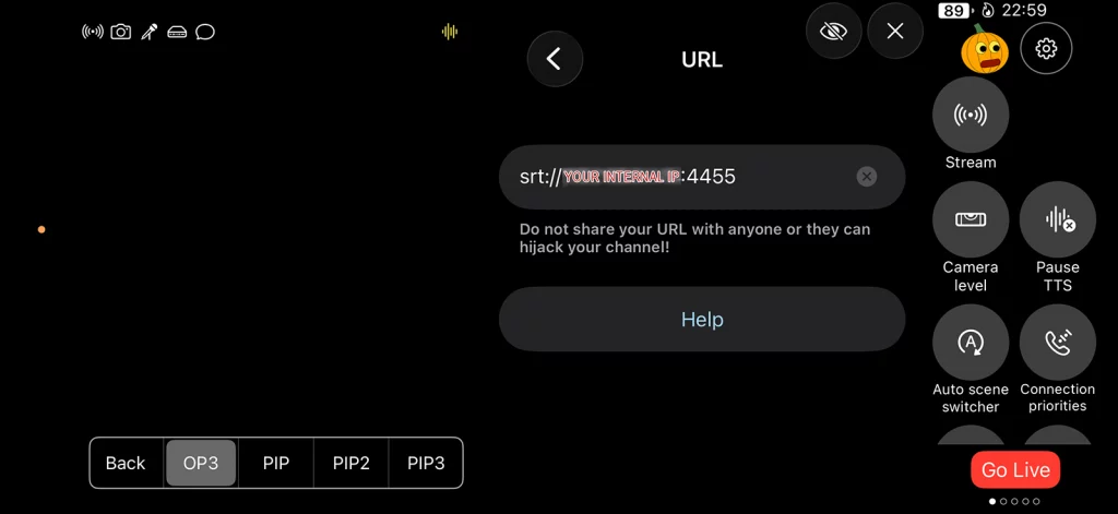 Type in the SRT URL (#2) srt://YOUR-IP:4455 and replace “YOUR-IP” with your local/internal/private IP address (see the following section if you are unsure on how to find this) and tap the Done button.