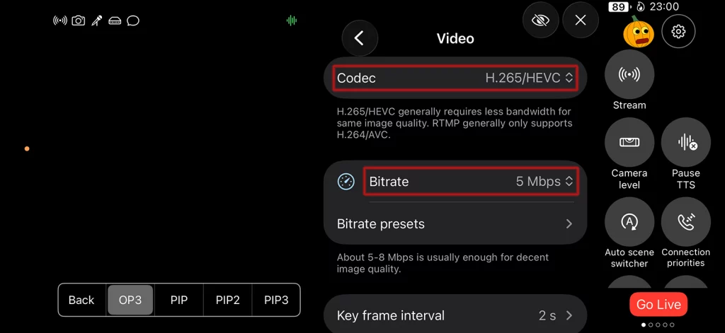 Scroll down and make sure the Codec is H.265/HEVC and Bitrate is 5 Mbps (at minimum).