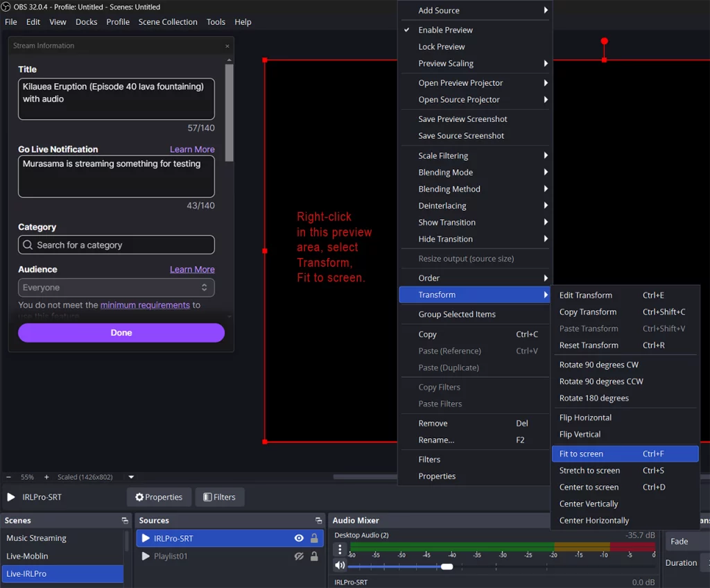 Click Ok to save these settings. Right-click anywhere in the preview, select Transform > Fit to screen. Manually resize as needed by dragging any part of the red border (or using Transform > Edit Transform to manually change the size/position).