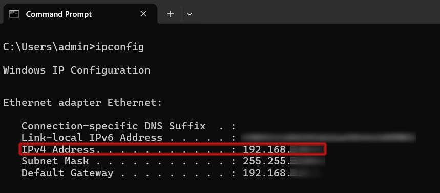 Type ipconfig and hit return. If your PC is on a wired connection, the IPv4 address will be listed under the “Ethernet adapter” configuration. If it is on a wireless connection, the IPv4 address will be listed under the “Wireless LAN adapter” configuration. This is the internal IP address that needs to be entered above.